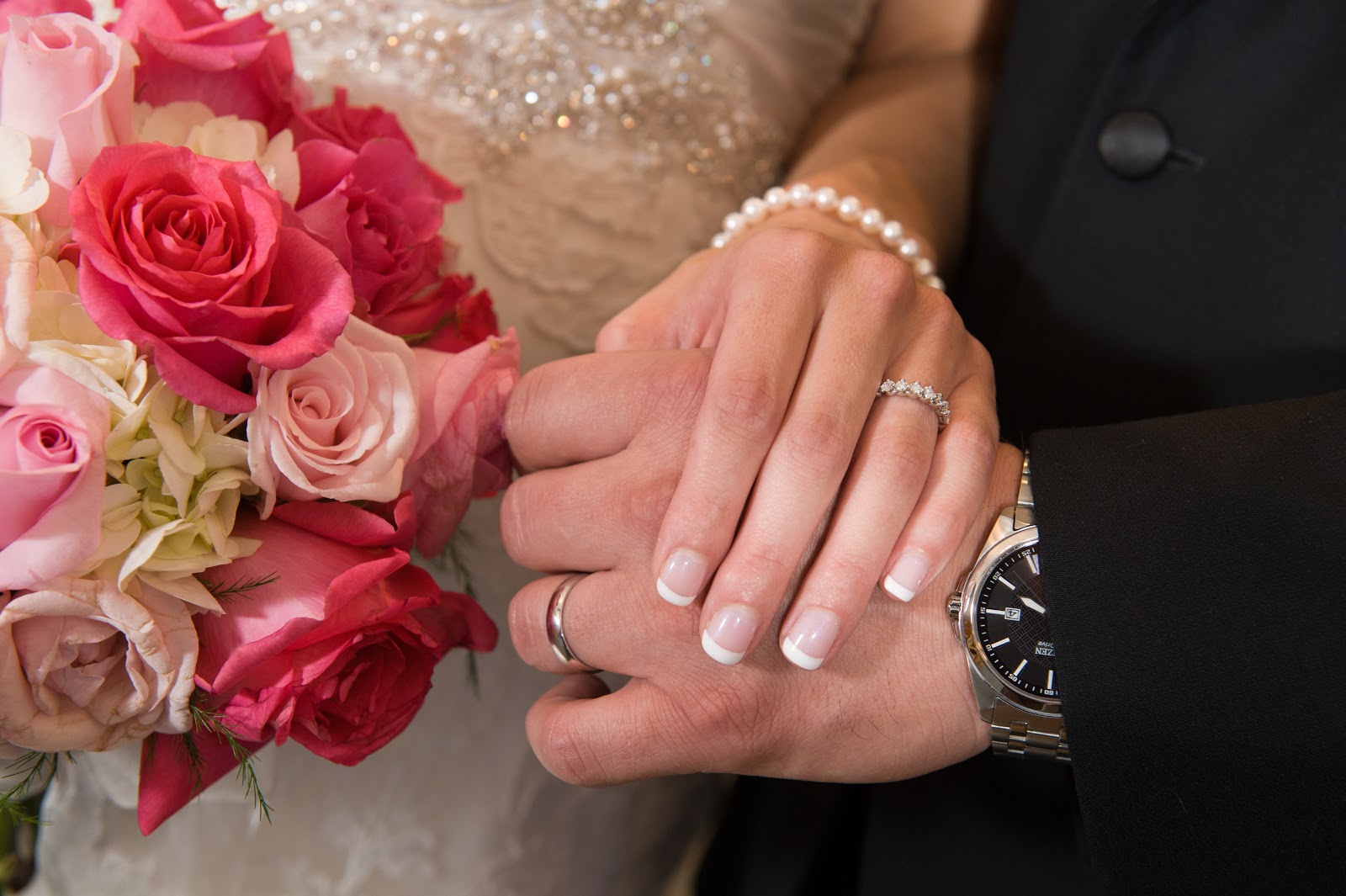 I absolutely love this photo because it captures SO many details: our rings (most importantly), our gifts to each other - my pearl bracelet and my hubby's new watch, my GORGEOUS bouquet of different shades of pink roses and white hydrangeas, as well as the lace and sparkle of my dress.