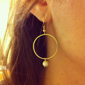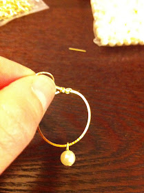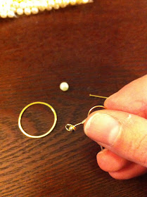 Step 4: Close the small hook around the big gold ring so that the opening is in the back of the earring and it is secured. You also want to make sure it can still move around the big ring. This will help the pearl hang nicely.