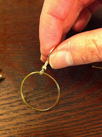 Step 1: Using the pliers, slightly open the small ring on the fish hook earwire. Attach one of the gold plated round solid rings to the earwire and close with pliers. It will look like this: